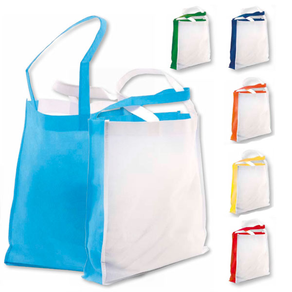 Shopper bicolore in TNT con manici lunghi, tessuto90 gr. Disponibile in colore bianco/giallo, bianco/ arancio, bianco/sky, bianco/rosso, bianco/verde e bianco/blu