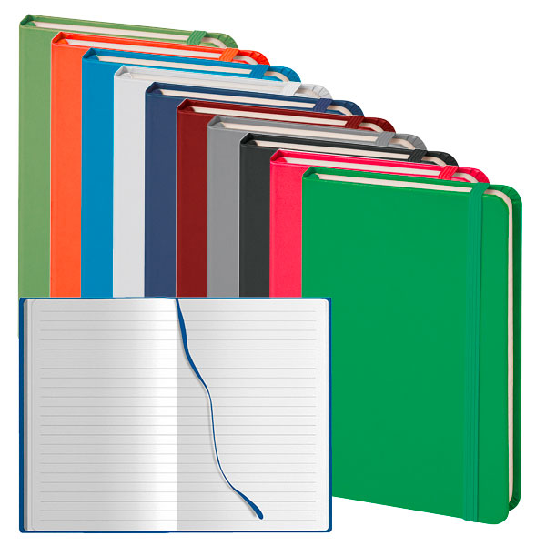 Block notes tascabile in midi cartonato con elasticoe segnapagine. 160 pagine a righe in carta bianca. Disponibile nei colori: verde, lime, blu, royal, azzurro, grigio, nero, rosso, bianco ed arancio.